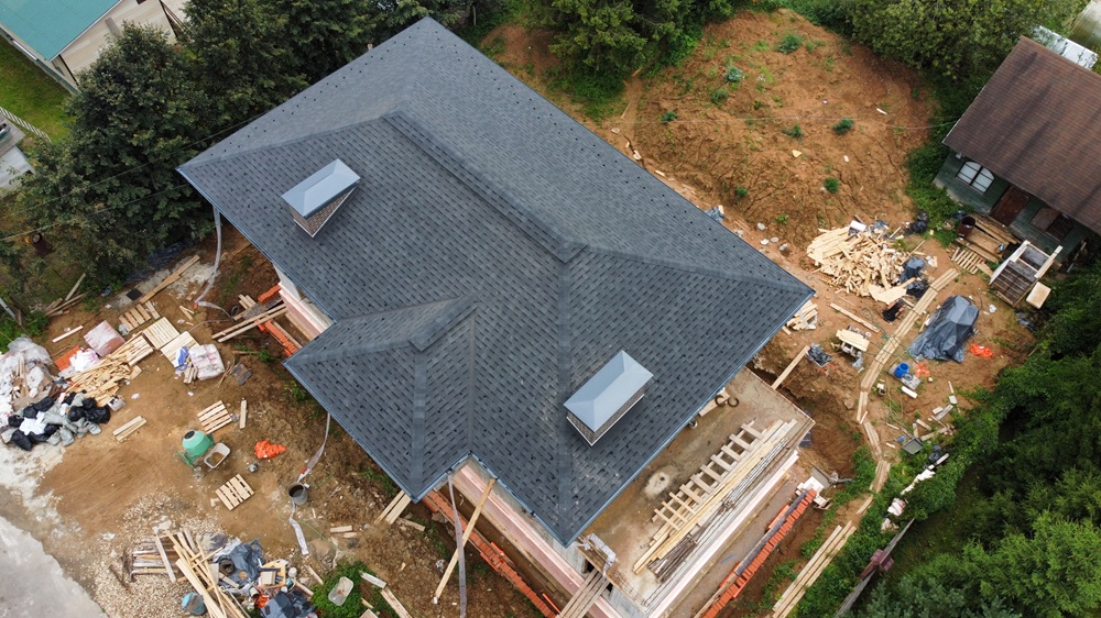 Мы выполнили монтаж стропильной системы, утепление кровли, устройство кровельного пирога, установку гибкой черепицы, кровельных шахт и дымников.